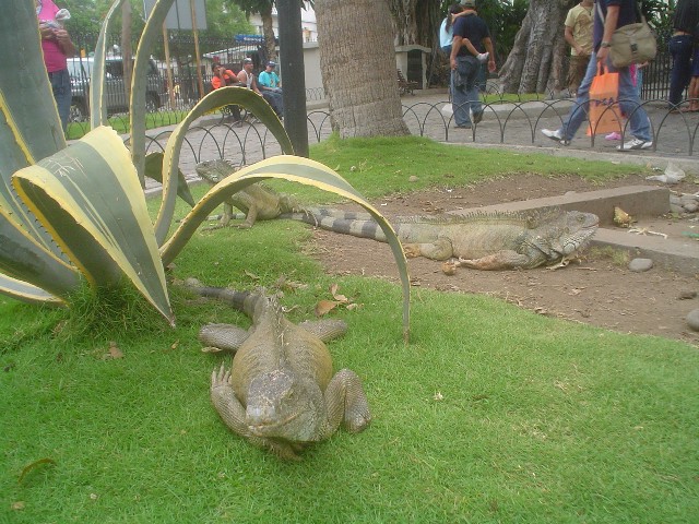 グアヤス川を渡る。大河だ。しかしあまり綺麗ではない。グアヤキルだ。降車場が100はあろうか。3階建ての大きなターミナルだ。人が多い。さすが350万の大都会だ。バスでセントロに向かう。セミナリオ公園はグアヤキルのシンボル的公園だ。シモン・ボリーバルの騎馬像が建っている。ボリーバル公園とも呼ばれている。公園内の広場をイグアナがのたのた歩いている。見上げると木にも鈴なりだ。リスもいる。何とも気持ち悪いが、市民のお友達のようだ。ガラパゴスへの起点とはいえ、驚いた光景だ。市民はイグアナ公園と呼んでいる。公園に面してカテドラルが建っている。グアヤキルの建物は19世紀末の大火でほとんど焼失したというが、このカテドラルもその被害を避けることは出来なかった。今の建物は1948年から30年かけて建てかえられたものだそうだ。